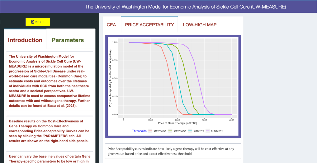 The UW-MEASURE microsimulation model web portal, which uses the R-Shiny platform, allows users to examine and adjust values that help to estimate healthcare and societal outcomes of SCD gene therapies.